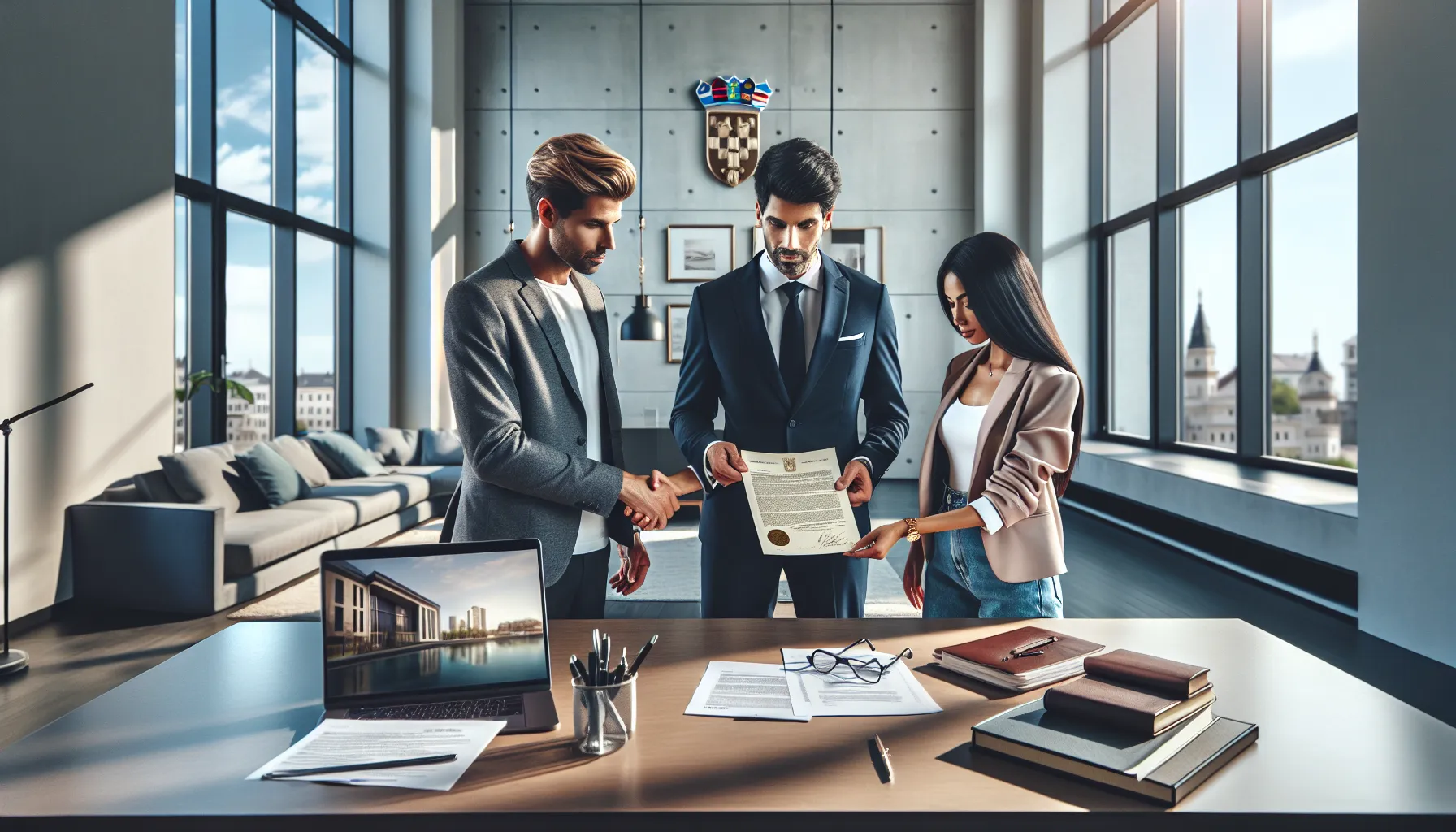 Croatian professional reviewing building permit document in modern office