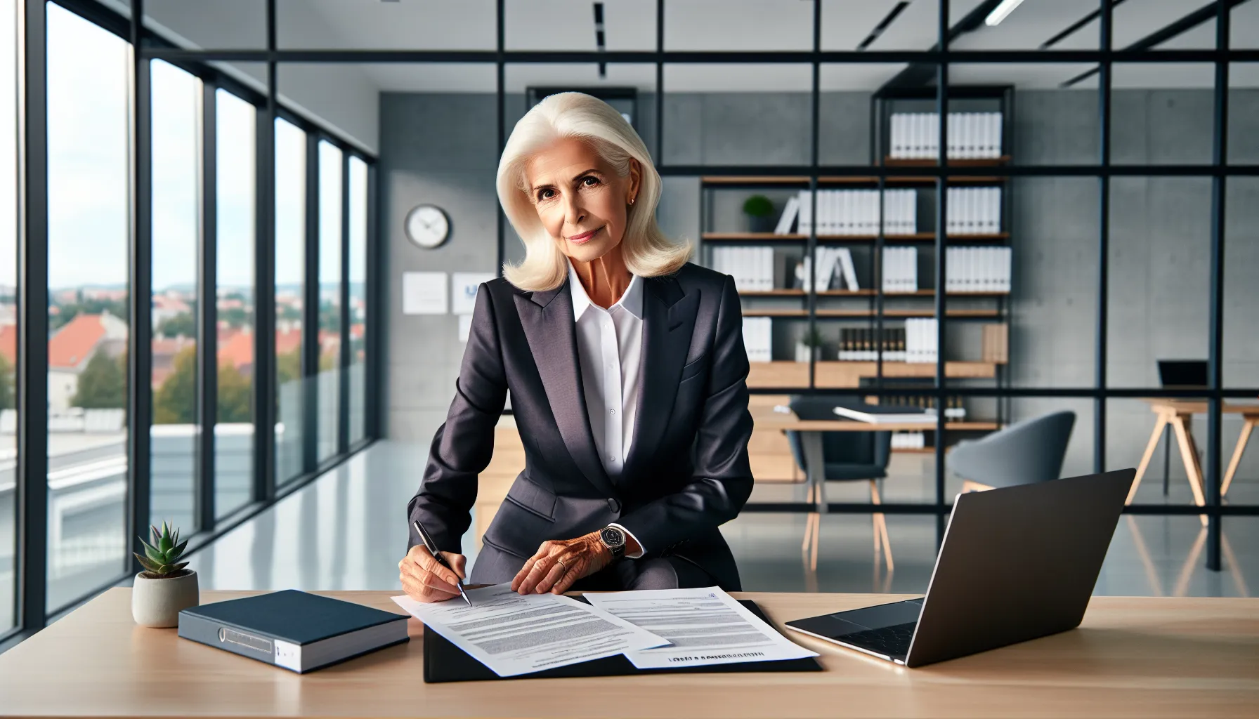Senior Croatian businessperson reviewing legal documents for company registration in modern office