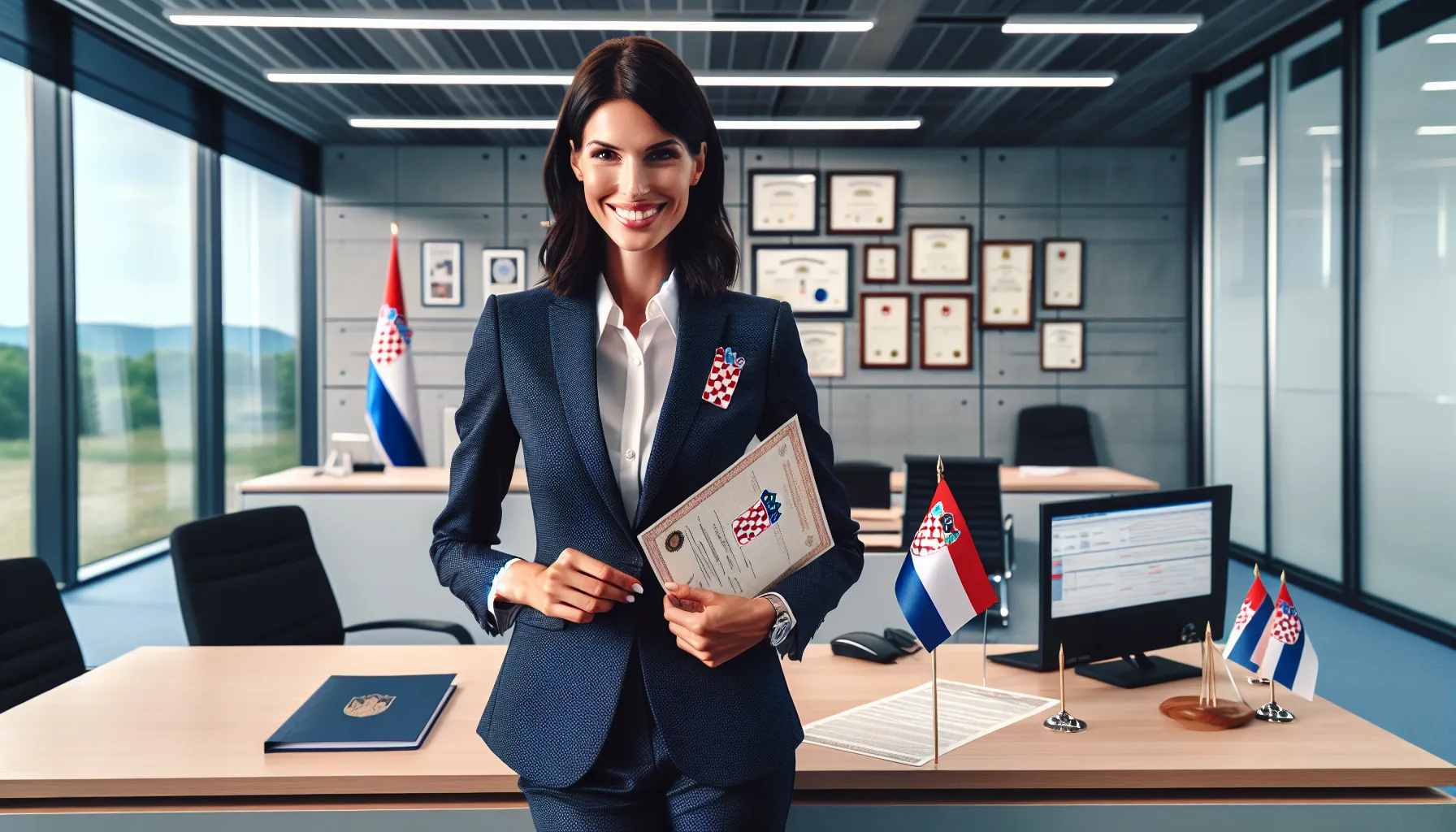 Professional Croatian woman reviewing citizenship documents in modern Zagreb office
