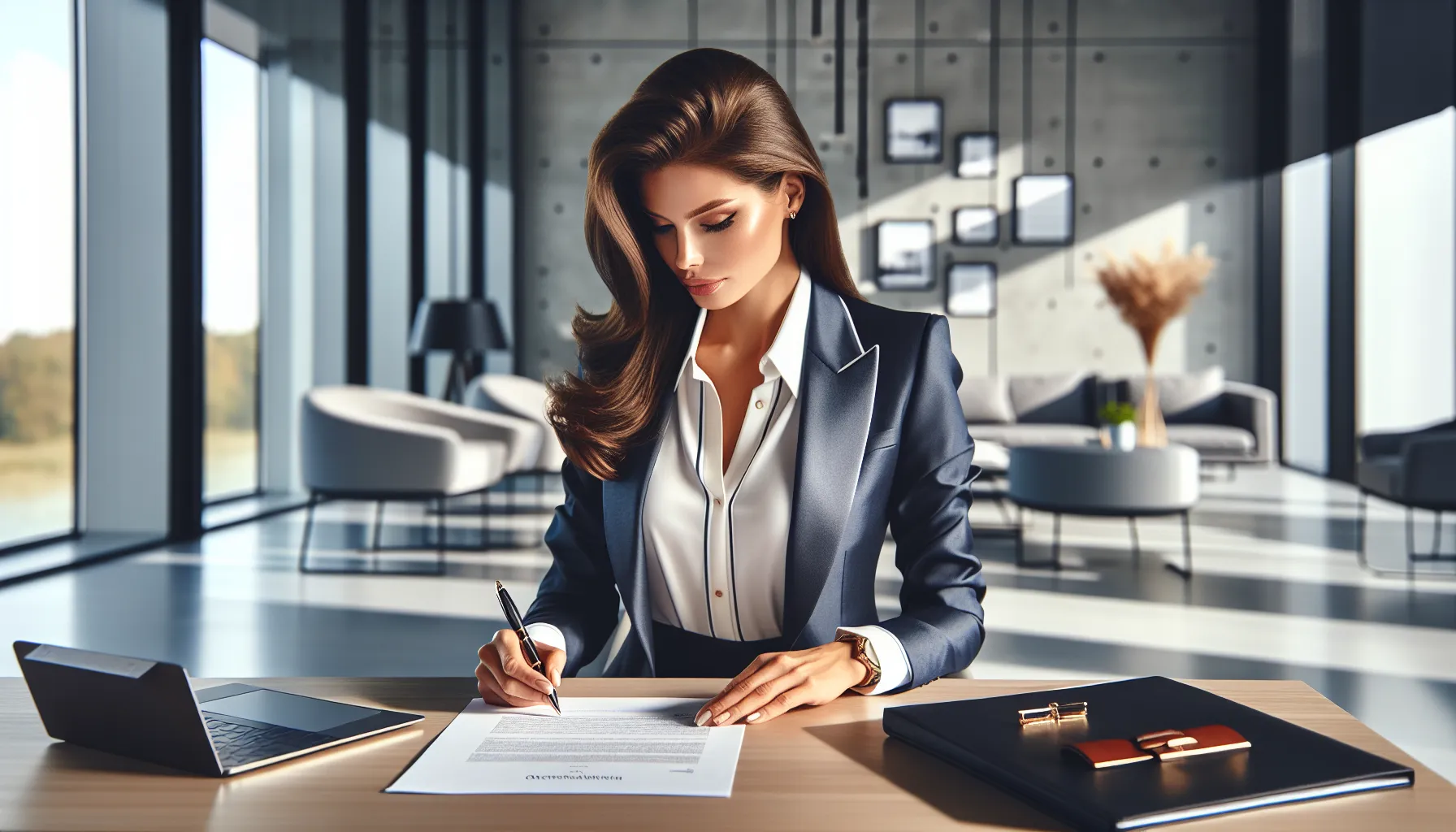 Professional woman writing formal resignation letter at modern office desk