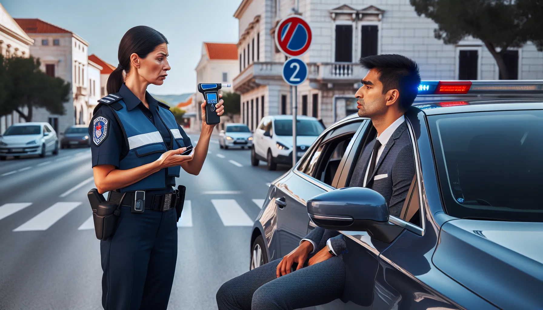 Croatian police officer conducting breathalyzer test on roadside with professional equipment